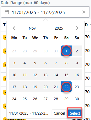 NOTE The default date range is the first day of the prior month through the current date. Any transactions within this range are displayed when the page loads.
