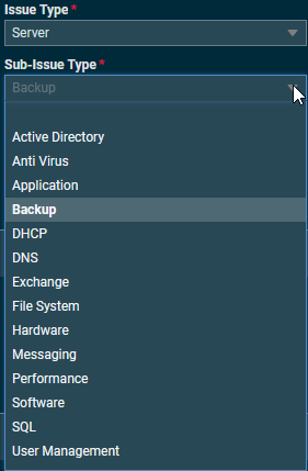 You manage issues and sub-issues on this page: Left Navigation Menu > Admin > Admin Categories > Features & Settings > Service Desk (Tickets) > Issue & Sub-Issue Types.