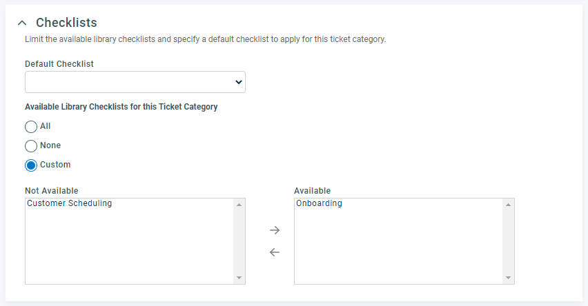 In this section, use the Available Library Checklists selector to specify which checklists, if any, from the Checklist Library will be available to add to tickets, tasks, or opportunities associated with this category. The category controls which library checklists, if any, are available for selection in the Checklist menu when you add or edit the item, and the default checklist. You can limit the menu selections to checklists that are suitable for items associated with this category. This becomes increasingly helpful as your checklist library grows.